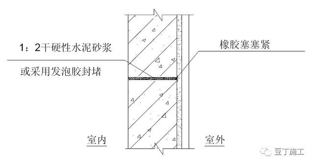 从外侧堵塞1:2干硬性水泥砂浆(添加防水剂及膨胀剂)到墙体中部并压实。