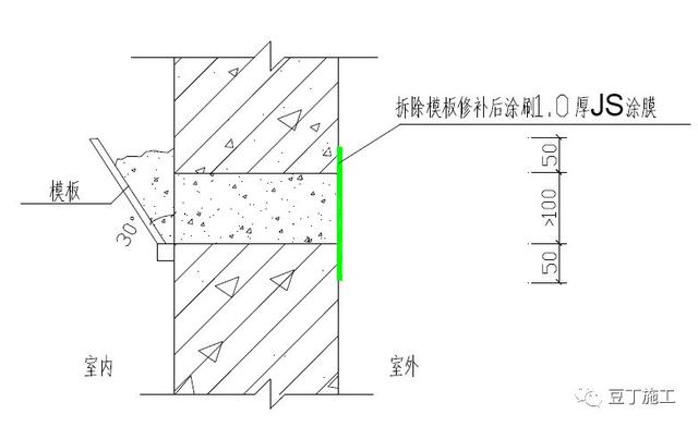 待外侧水泥砂浆干燥后(约24 小时),在外侧孔洞及周边分多遍涂刷1.0mm 厚JS 防水,涂刷范围为100100mm。