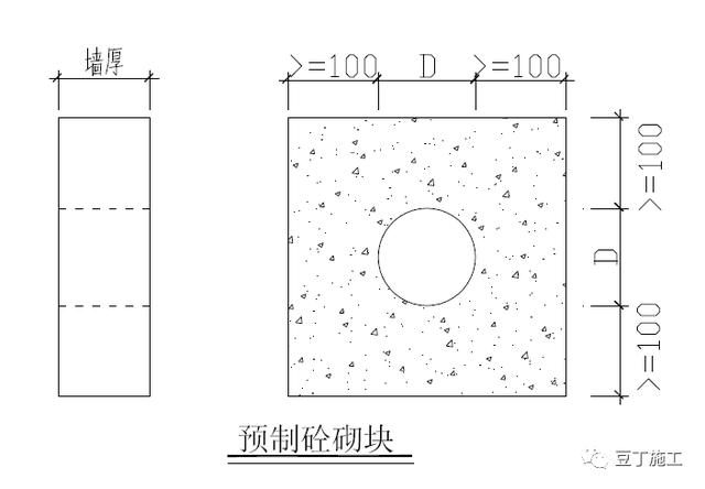 预制混凝土块强度等级C20,厚同墙厚,长、宽尺寸均不得小于300mm,并符合砌块模数;预制混凝土块时须预埋80U-PVC管,U-PVC管应内高外低,内外高差20mm ;U-PVC管长度应为墙厚加墙两面饰面层的厚度,有保温时尚应包括保温层厚度。预制混凝土块应标明内外,以免砌墙时出错。