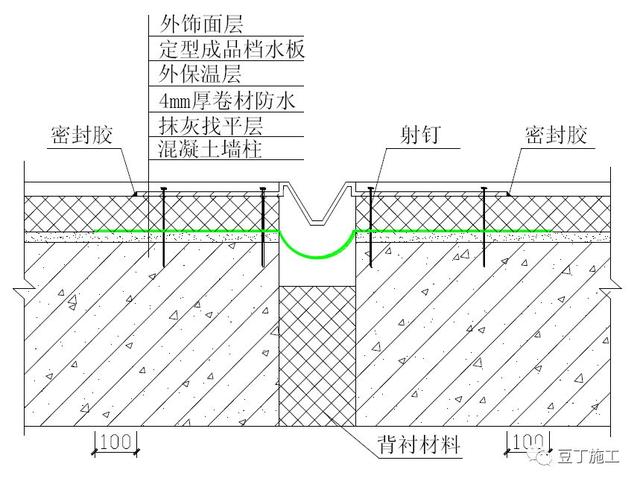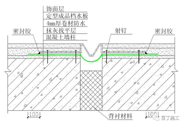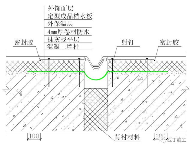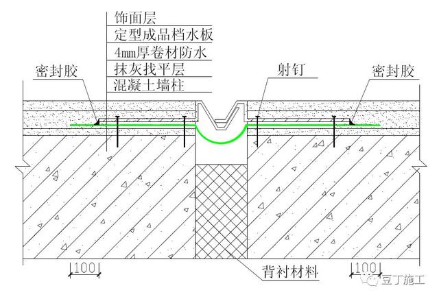 安装定型成品挡水板,挡水板必须固定在墙体上。挡水板材质可为不锈钢、铝合金、镀锌铁皮。