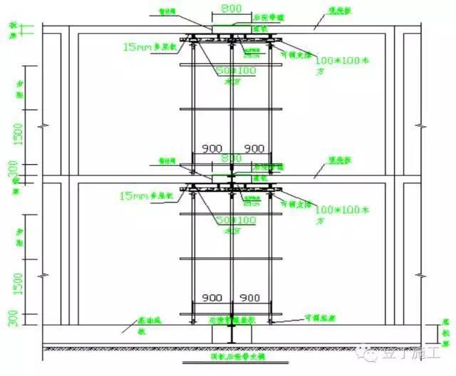 (3)模板的支设同原设计梁(墙)板尺寸,下部支撑必须顶紧,地下室外墙加固用对拉止水螺杆。