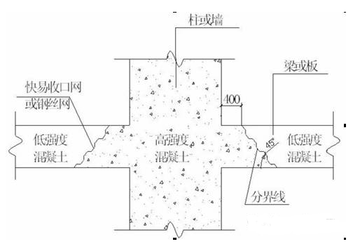 A、对于非钢骨混凝土的梁板与柱墙,为达到高层建筑工程的抗震效果,按照施工时尽量少留施工缝的原则,梁板与柱墙一起浇筑,浇筑方法应由一端开始用赶浆法,即先浇筑梁,根据梁高分层阶梯形浇筑,当达到板底位置时再与板的混凝土一起浇筑,随着阶梯形不断延伸,梁板混凝土浇筑连续向前进行。对于梁板与柱墙一起浇筑的混凝土,梁板与柱墙相接的核芯区在柱、墙边应用钢丝网进行封堵来区分高低标号混凝土。浇筑示意图如下: