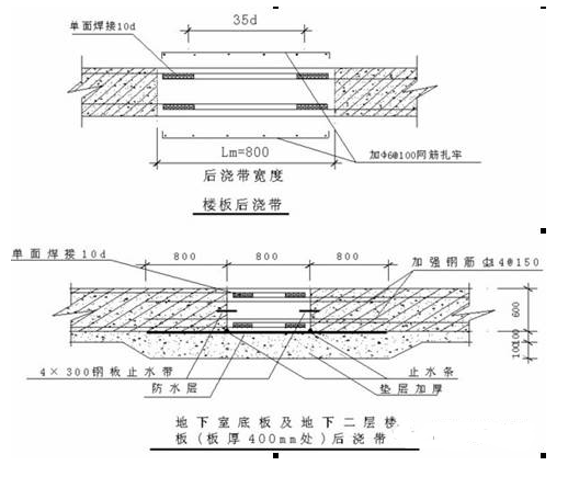 地下室顶板及楼板,板带内的钢筋先做分离处理,浇筑板带混凝土前将两侧分离钢筋加焊,后浇带处的梁钢筋混凝土可连通,如下图所示: