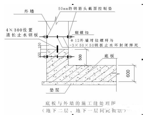 N、地下室底板与外墙板交接处的施工缝应在距离底板面500mm左右较合适在浇筑地下室外墙,事先需安装好止水钢板后,才能浇筑混凝土,外墙的施工缝留在基础梁(或结构梁)面上来500mm,见下图: