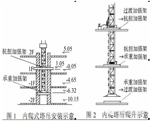 考虑到内爬式塔吊的工作覆盖面和安装井道的结构特点, 一般内爬式塔吊安装于电梯井内。