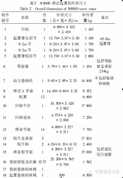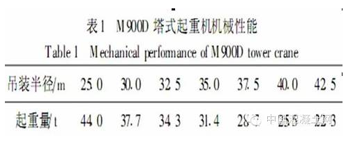 广州新电视塔钢结构工程选用 2台澳大利亚 FAVCO 产M900D 型外挂内爬式塔式起重机,分别布置于核心筒长轴两端, 中心间距25.6m。该塔式起重机塔身高 60m, 起重臂长 45.8m, 起重力矩12 000kNm,机械性能如表1所示。