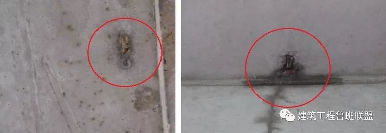 处理意见:凿除支模木支撑或铁丝后修补混凝土并做好防水措施。