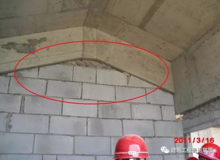 产生原因:斜梁(板)底砌体未按踏步砌法进行砌筑。
