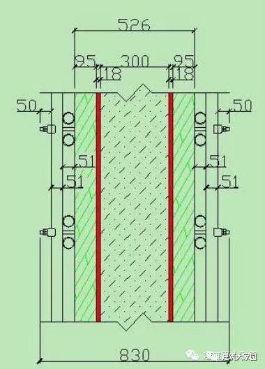4.5米以上高度墙体对拉螺栓长度计算: 墙厚+218(模板厚)+295(方木厚)+251(水平钢管外径尺寸)+251(竖向钢管外径尺寸)+2(50~75)(钢管两边预留长度)