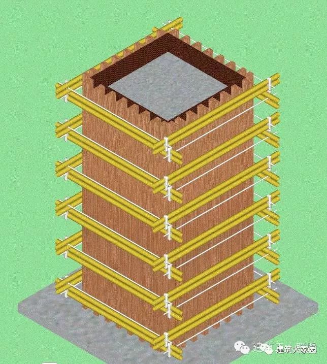 超高墙体加固体系一般由模板、方木、水平方向钢管加固杆、竖直方向加固杆、山形卡、丝帽等组成,其模板侧压力传递顺序如下:模板方木水平方向加固钢管竖起方向加固杆山形卡对拉螺栓。