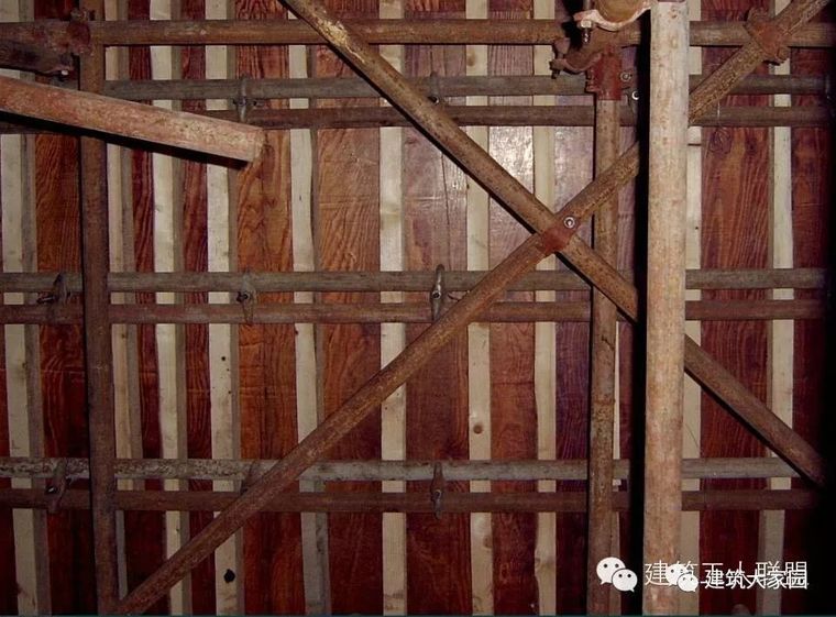 普通高度墙体(4.5m以下)加固体系一般由模板、方木、水平方向钢管加固杆、山形卡、丝帽等组成,其模板侧压力传递顺序如下:模板方木水平方向加固钢管山形卡对拉螺栓。