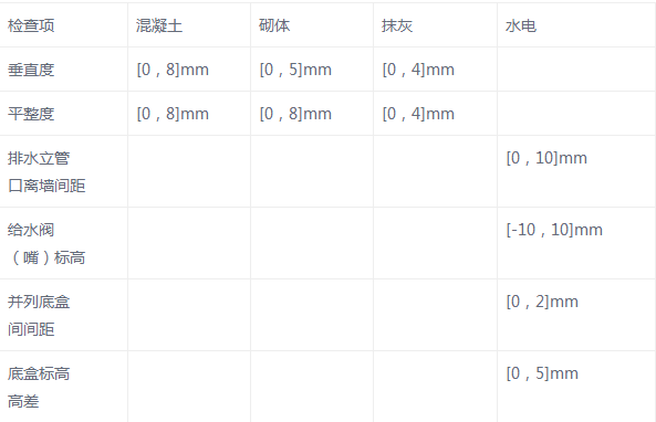 1、指标说明:该指标为厨房、卫生间、阳台位置墙面给水配件、排水管道安装标高与设计标高的差值。通过控制此指标,避免因偏差过大,造成用水器具安 装困难;