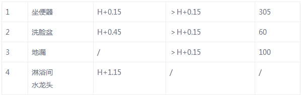 其中:第三栏为给水阀安装高度(m)、H为装修完成面标高,第四栏为排水安装高度(m)、 H 为装修完成面标高第五栏为排水立管中心距装修完成面距离(mm)。