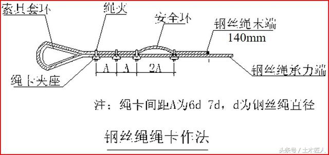 绳卡压板应在钢丝绳长头的一侧(即紧贴主受力绳),其间距不应小于钢丝绳直径的6倍,一般为6-7倍。钢丝绳与结构边、结构梁等硬物相接触时应在接触位置加设软防护。