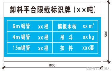 卸料平台的方案中有明确的限定它的载重量,应在卸料平台的防护栏杆上挂设限载牌。限载牌的内容如图,应明确表述卸料平台所能承载的各类材料的具体数量。且在对工人的安全教育过程中应作出强调,并在卸料平台的使用过程中加强监督。
