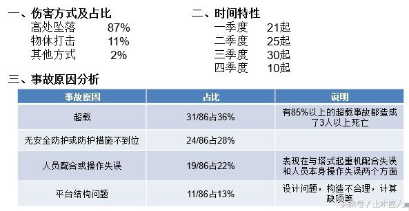 论文中调查了近年来86起卸料平台施工事故的原因,并形成统计,得出以下特征:
