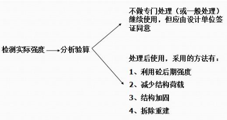 例案1、辽宁省某地一幢四层办公楼,使用一年后,发现顶层主梁与次梁普遍出现斜裂缝,多数裂缝宽大于0.3㎜,最宽处达1.5㎜,裂缝位置绝大部分位于靠支座处和集中荷载作用点附近。据查这批梁是在冬季施工的,混凝土配料和搅拌质量较差,成型后又受冻害。原设计强度为C20,两年半后测定实际强度接近15N/㎜2。如何处理?