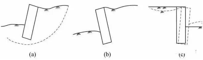 刚性挡土墙是水泥土搅拌桩、旋喷桩等加固土组成的宽度较大的一种重力式基坑围护结构,其破坏形式有如下几种: