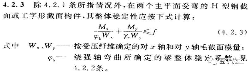 (2)抗弯计算强度f=M/1.05W+N/A公式说明,根据《钢结构设计规范》(GB50017-2003)拉弯构件和压弯构件的计算公式如下,y-y轴没有弯矩作用,公式简化为上面的公式。
