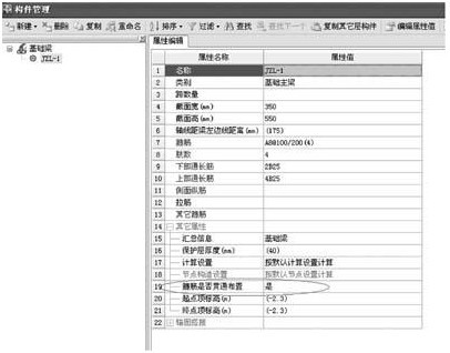 (2)基础层中基础梁属性定义时, 当图纸上为两个主梁相交时,需要我们自已判断哪根梁为主梁,因为主梁的箍筋根数要通长计算。而另一根梁的箍筋应该是距主梁边开始布置的,但软件的默认设置是基础主梁的箍筋全部通长计算,这样就需要我们在定义属性时就确定此根梁箍筋是否贯通布置,如下图: