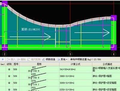 最后就按普通斜板的处理方法,画上钢筋.处理好与梁相关构件,再计算.一块手工花上半天几乎都计算不准确的弧形斜板就完成了.