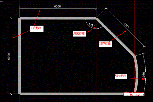 4.弧长标注:对于弧形线性构件的标注。点击弧长标注按钮,选择弧形线性图元的两个端点即可完成标注。