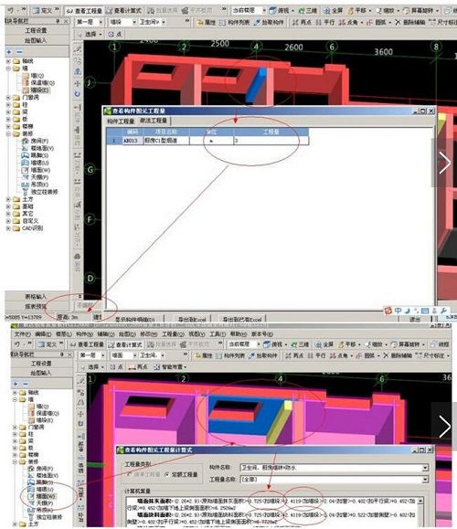 由上图我们可以看到,定义一次构件,绘制一个飘窗图元,我们可以把飘窗顶板、底板的内外抹灰、饰面涂料飘窗板砼工程量飘窗板模板面积飘窗塑钢窗面积全部计算出来;计算结果如下图: