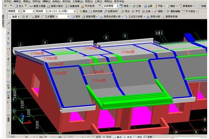 如上图,绘图步骤如下:1、分别定义120mm100mm130mm厚度现浇板;2、以120mm为基准,绘制现浇板;3、以屋脊线、转折线为基准线分割120mm现浇板;4、利用三点定义斜板功能,设置斜屋面;5、执行平齐板功能;6、找到100mm120mm斜板位置,以此位置为基线分割120mm斜屋面图元;7、选中相应的板块,修改属性对话框名称为100mm或者120mm板;这样,一切OK!软件会在保持斜屋面整体坡度不变的前提下把不同板厚的现浇板区别开来;