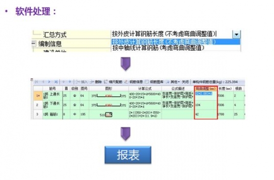 传统算法:预算按外皮,下料按中心线但不绝对,还要根据当地定额规定确定有些地方定额规定按图示长度计算指什么?图上长度:指图中标注的长度,未考虑弯曲调整等情况,指外皮长度;如没有地方规定明确说明,预算采用按外皮计算即可;3、在软件中是如何处理这个问题的呢?