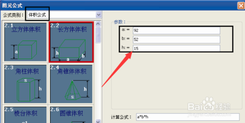 例如:择挖基础土方清单项,双击工程量表达式单元格,使单元格数字处于编辑状态,即光标闪动状态。点击右上角按钮。在图元公式界面中选择公式类别为体积公式,图元选择2.2长方体体积,输入参数值如图所示。