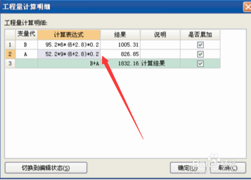 例如:选择填充墙清单项,双击工程量表达式单元格,点击小三点按钮,在工程量计算明细界面,点击【切换到表格状态】。点击鼠标右键选择【插入】,连续操作插入两空行,输入计算公式如图所示。