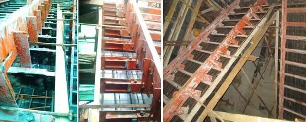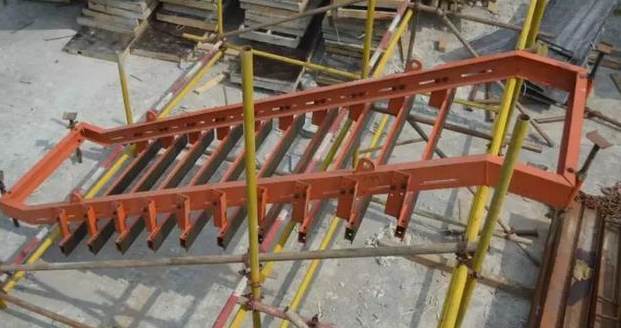 使用钢板材、槽钢、角钢等材料制作的模板强度高、刚度好,根据不同楼梯踏步设计参数,确定最佳楼梯踏步变动范围,通过各部件连接处开槽、成孔,实现每一个踏步挡板可以上下前后调节位置,并满足每一个踏步变动范围;通过工具化各部件,以标准楼梯为基准,扩展非标准部件;全部采用螺栓连接代替焊接技术,楼梯可灵活组装、拆解,一般楼梯规格均适用;组装后可利用塔吊进行垂直运输,整体吊装,整体拆除。确保位置准确,达到施工和设计要求目的。