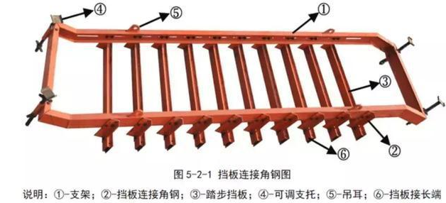 利用型材加工,通过螺栓连接解决了楼梯模板焊接定型造成各部件位置相对固定不变的问题,采用16#槽钢作为模板支架,两侧末端通过10mm厚L型连接板与横向短槽钢支架螺栓固定,形成模板支架架构。楼梯钢模板各功能部件如下图①~⑥,其中模板支架部件通过连接角钢部件与踏步挡板部件采用40mm长8.8级螺栓连接,达到楼梯模板可在操作面一一被散拼成整体使用,可拆解成每个单体部件搬运;也可在使用前现场组装完毕后再整体吊装、整体拆除,实现了楼梯钢模板的工具化。