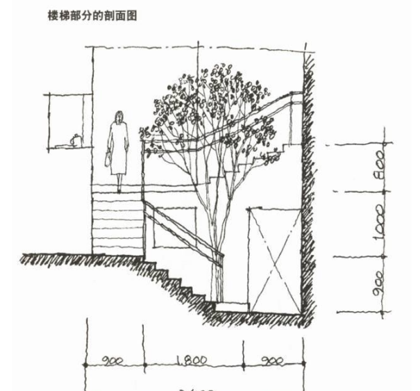 从中间的楼梯踏面计算,宽度为1350mm/6=225mm。请注意外围的楼梯口不是紧贴着天井的拐角,而是略微向后设置。这样可以使右侧连接楼梯口的道路变宽,从而消除心理上的不安全感。