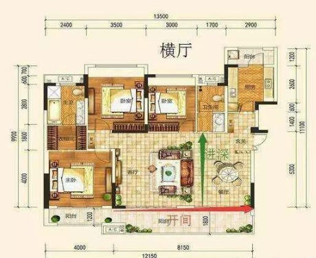 横厅减少了过道空间,提高了户型的使用率,更大气,并且采光和通风效果更好。