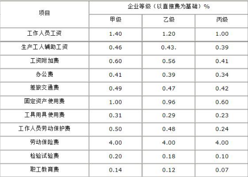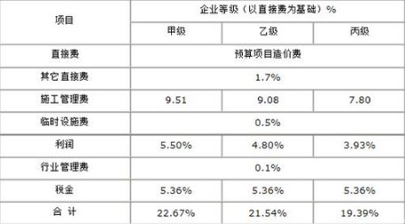 三、施工管理费:指不属于任何分部工程之内的费用,而是发生于全部工程的组织和施工管理的费用,取费标准是根据企业的资质等级表现其不同费用率包干使用。以下是陕西省内的标准: