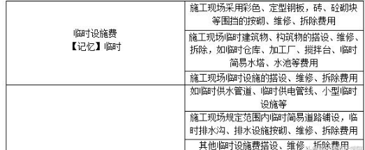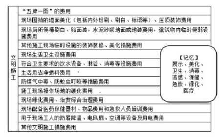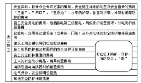 【注】措施项目费的构成,以选择题形式出题,一般是文字归属题,记忆时注意对比记忆,掌握各个费用的组成部分。