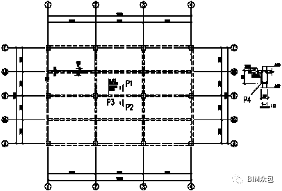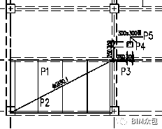 这时,我们已经将图形左上角的楼板下沉了120mm。下面,我们把该楼板的边缘梁线改成实线。由于构成该楼板左右2侧的梁是主梁,因此我们在把梁线变实前,首先要利用AutoCAD的Break命令,把这2根主梁线在P3、P4点断开。