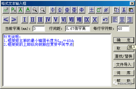 点取菜单后,出现图 29所示对话框:对话框的第一行是一排按钮,用于输入钢筋直径和角标等特殊符号;在第二行的编辑框中,我们可以很方便的对文字高度、行间距和每行的字符数进行调整,从而达到排版的目的;最右侧的一排按钮可以对文字进行增强处理: