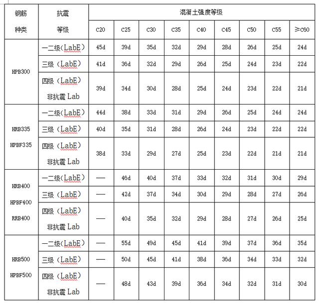 2.受拉钢筋基本锚固长度Lab、LabE见表2。
