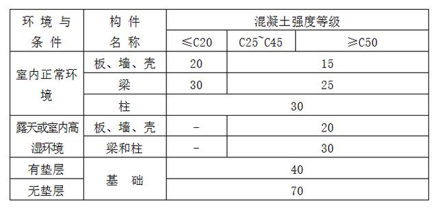 注:1.板、墙、壳中分布钢筋的保护层厚度不应小于表1中数值减10mm,且不应小于10mm。2.梁、柱箍筋和构造钢筋的保护层厚度不应小于15mm。3.钢筋位置的允许偏差,钢筋安装位置的允许偏差和检验方法应符合表6的规定。