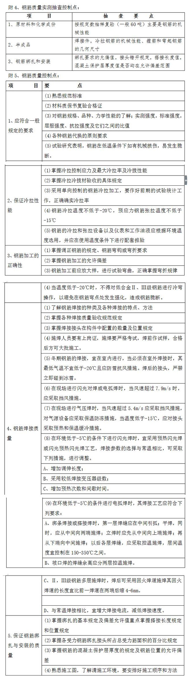 钢筋工程是钢筋混凝土结构中的主要受力材料,它与混凝土材料的结合才能构成坚固的实体,使之应用于安全度要求很严的建筑产品中,如钢筋工程中任一项内容未严格按规范设计要求进行配制和施工,轻则影响使用功能,重则造成建筑物的倒塌。冬期施工的钢筋冷拉,张拉与焊接应符合冬期施工规程中的规定,严格控制负温施工条件及温度界限。