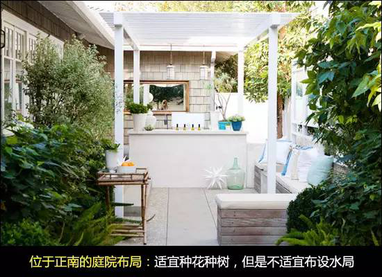 南方是具有火气的方位。庭院设置在这个方位上,日光充足,庭院适宜种花种树,但是不适宜布设水局,在这种方位的院子里布设水,会影响财运或因财惹祸。此外因这方位具有很强的火气,所以不适宜种红色的花。