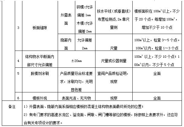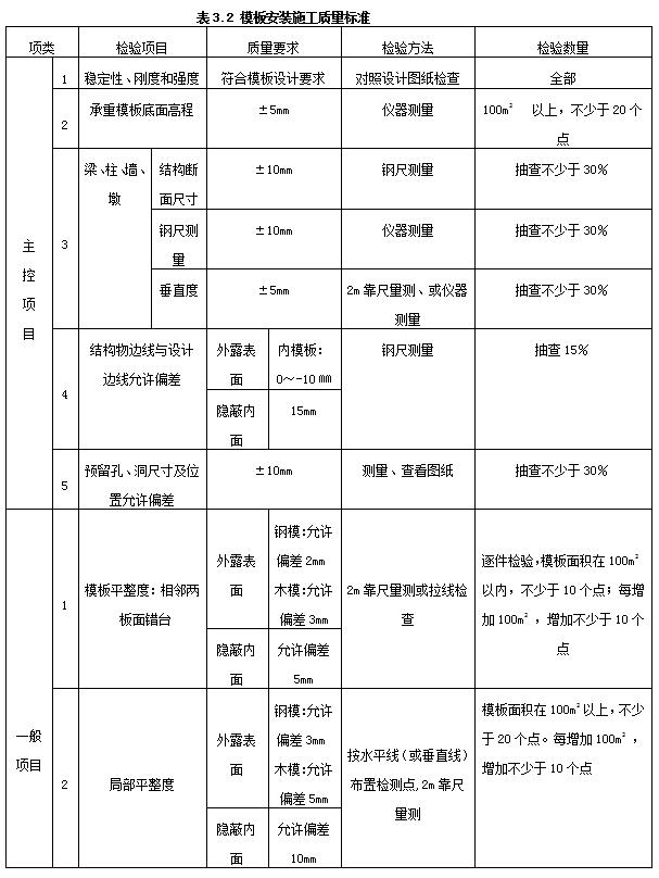 3.1 本标准适用于定型或现场装配式钢、木模板的制作及安装;对于特种模板(镶面模板、滑升模板、拉模及钢模台车等)应符合有关的技术标准和设计要求的规定。 3.2 模板安装施工质量标准见表3.2 。