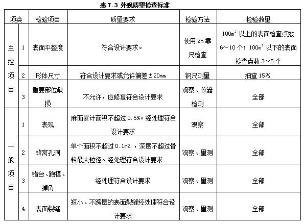7.1 混凝土拆模后,应检查其外观质量。当发现有混凝土裂缝、蜂窝、麻面、错台和模板走样等质量问题或事故时,应及时检查和记录。