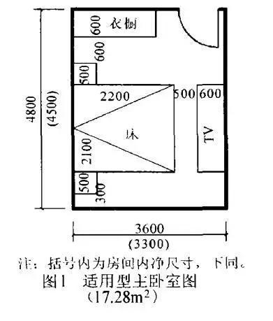 1.主卧室的最低开间中到中尺寸是3. 6m(净3. 3m),最低进深中到中尺寸是4.8m(净4. 5m)。这是保证家具摆放和人的活动最低适用要求的尺寸(图1)。