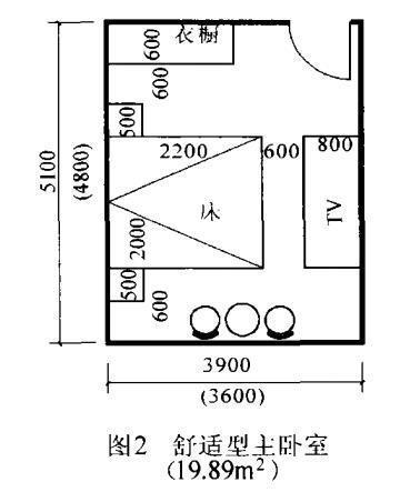 2.主卧室的舒适开间中到中尺寸是3. 9m(净3. 6m),进深中到中尺寸是5.1m(净4. 8m)。这时家具摆放和人的活动是比较方便舒适的(图2)。