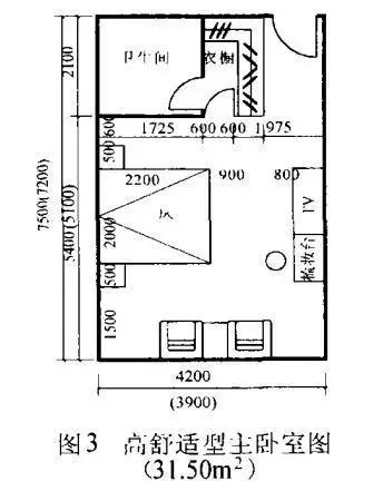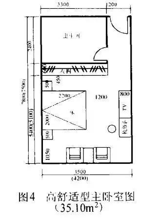 3.主卧室的高舒适开间中到中尺寸是4.2m(净3. 9m),进深中到中尺寸是7. 5m(净7. 2m)。这时家具摆放和人的活动会更加方便舒适;不仅如此,到了这一级,主卧室就应该配有主卫生间和进入式衣帽间(图3)。或不设进入式衣帽间,以把卫生间做大,使洗浴更加舒适(图4)。
