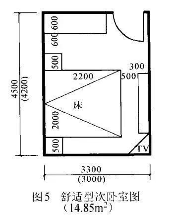 次卧室为住户非主人使用的卧室,它的最低适用开间中到中尺寸是3. 3m(净3. 0m) ,进深中到中尺寸是4. 5m(净4. 2m),如图5。这里讲的是最低适用要求,因为小于这个尺寸就会给家具布置和人的活动带来不便,也就是说小于这个尺寸的房间就不应设计为卧室,而应设计为书房、儿童房、保姆房等功能的房间。若户建筑面积比较大或很大,次卧室也分别提高到上述主卧图1或图2的标准,这时次卧室也就分别达到了舒适或高舒适的要求了。
