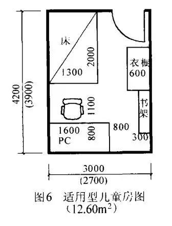 儿童房设计成开间3. 0m、进深 4. 2m、面积12. 60㎡,可满足家具摆放和人的活动要求,即适用要求(具体可参见图6)。当然,如果户型面积足够大,将儿童房按图5次卧尺寸(开间3. 3m、进深4. 5m、面积14. 85㎡)或按图1主卧尺寸(开间3. 6m、进深4. 8m、面积17. 28㎡)设计,则可使儿童房达到舒适或高舒适的要求。同时,儿童是要长大成人的,按次卧或适用主卧设计儿童房,还可使儿童长大成人后不必更换房间,仍然室有适用舒适的房间供其使用。另外,设置儿童房还可使住宅套型设计更方便,即将受户面宽和进深限制不能将其设计为主卧、次卧、客房的空间设计为儿童房。